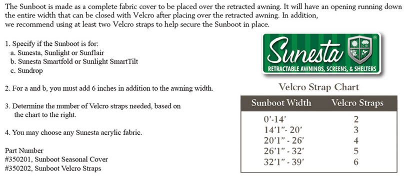 Give us a call with the size of your awning for your free estimate for your Sunboot.