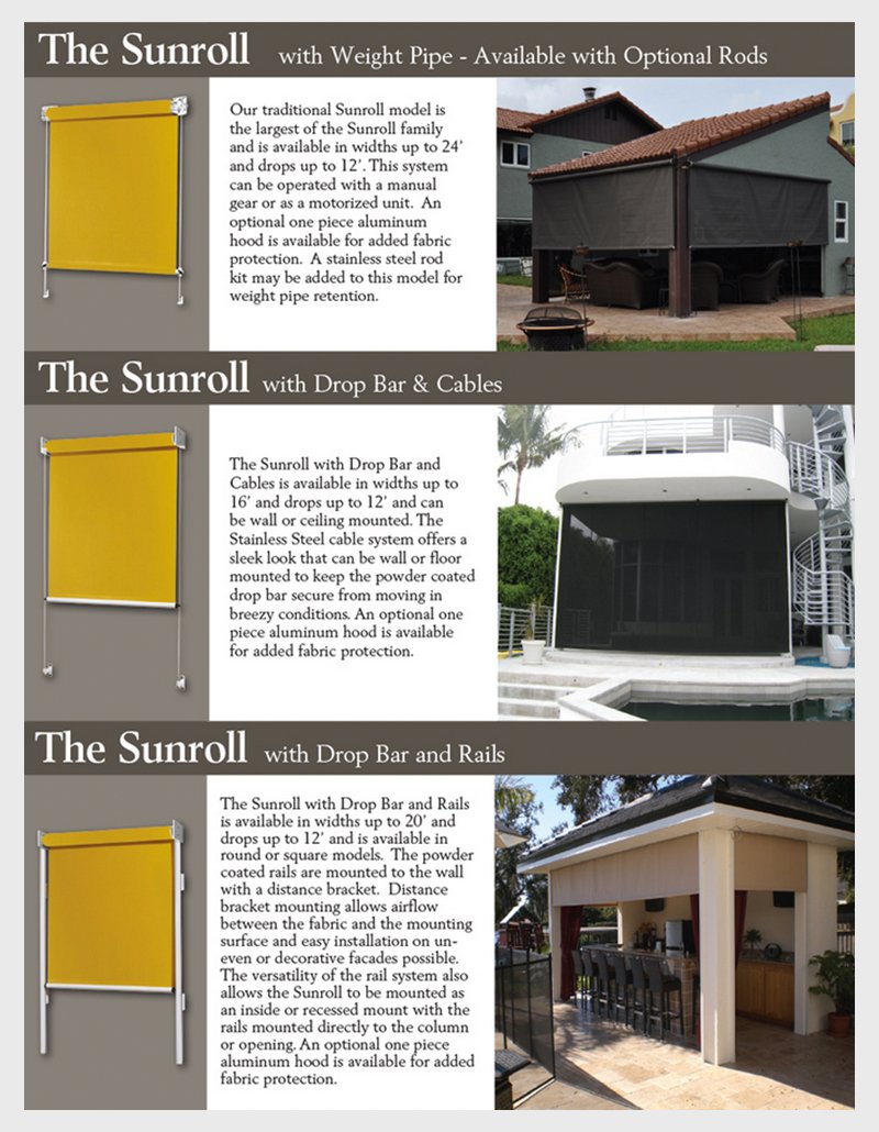 - The Sunroll with Weight Pipe: The Sunroll model features the option of a one-piece aluminum hood for added fabric protection. Also, a stainless steel rod kit completes this model, offering weight pipe retention.
