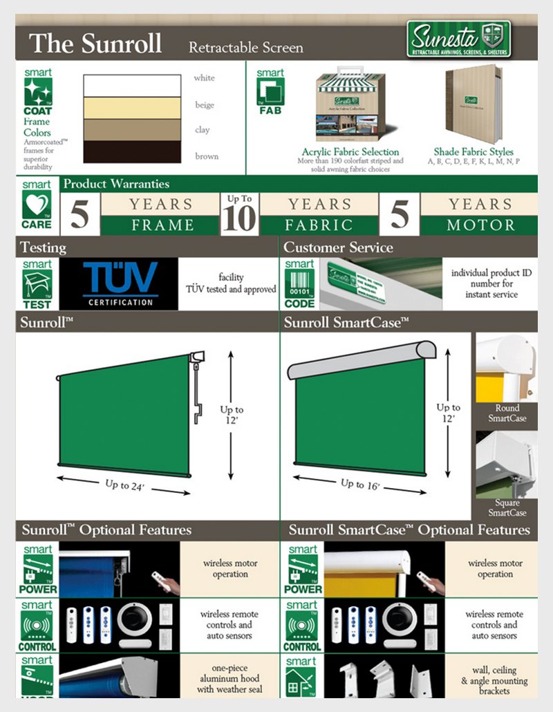 - The Sunroll Smartcase with Drop Bar & Cables: This retractable screen model features a stainless steel cable system that offers a sleek-looking design. Clients can choose from either a square or rounded design that can be wall or floor-mounted.